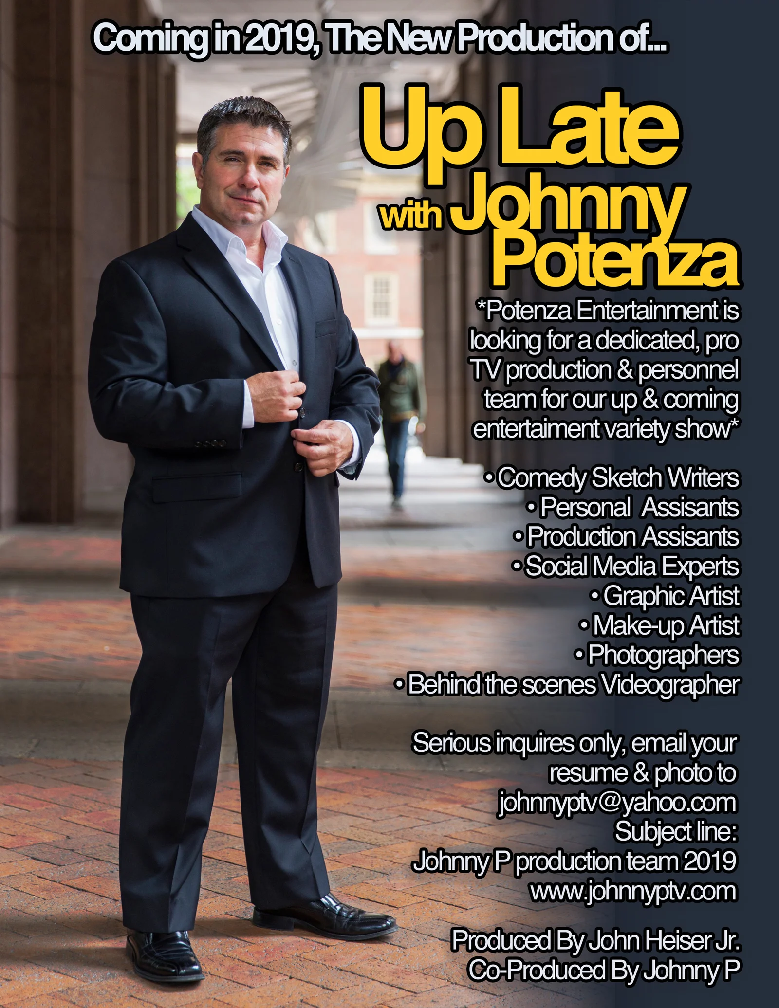 Introducing my new producer John Heiser for the new production of “Up Late with Johnny Potenza”, John Heiser Jr. has been working in the television industry for the last 25 years & is a big part of the new show.