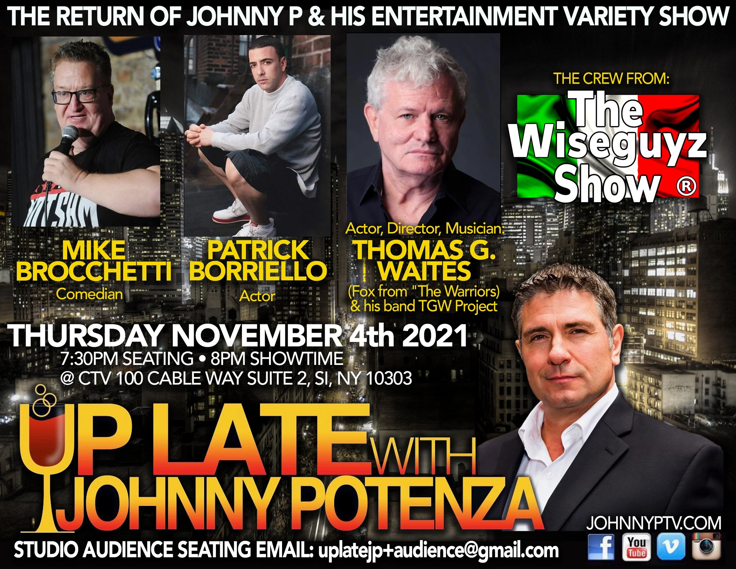 February 6, 2020 is the next “Up Late with Johnny Potenza” show featuring special guest actor Lou Martini Jr, author Nick Christopher, comedian & host of NYC Crime Report & “The Live Music Experience” of Jem & The Vibe. For free studio audience seating go to the “Up Late Tapings” tab & get your name on the list. You won’t get in the show unless your name is on the list. It’s very easy to do.
