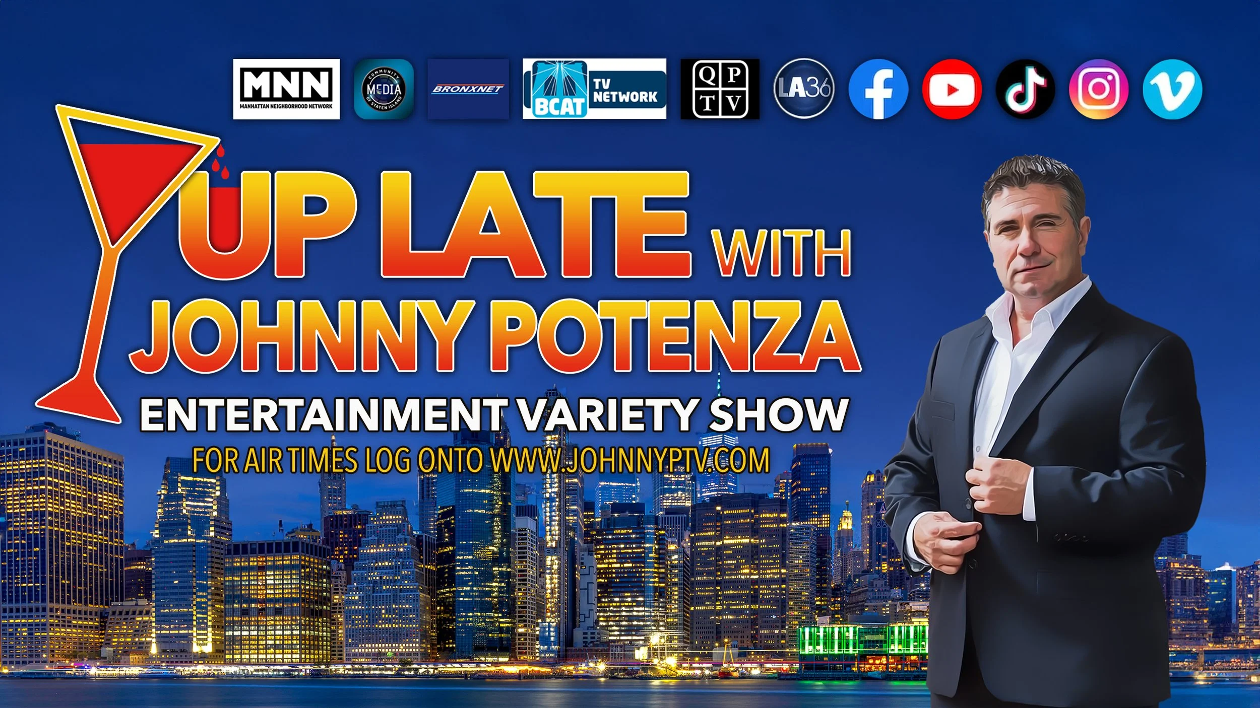 The Up Late with Johnny Potenza FINALE! Featuring, Sandy Blue Eyes, Gab Cinque Band. Special guest City Councilman Frank Morano introducing the Breakin' Ballz with Johnny P podcast cast actors Lou Martini Jr. & Concetta Rose Rella. Show. NOW STREAMING on Youtube (LInk Below), Vimeo.com also AIRING on your local cable tv channel MNN (Manhattan), BCat (Brooklyn), Bronxnet (Bronx), QPTV (Queens), CMSI (Staten Island) & LA36 (Los Angeles) January 2026.