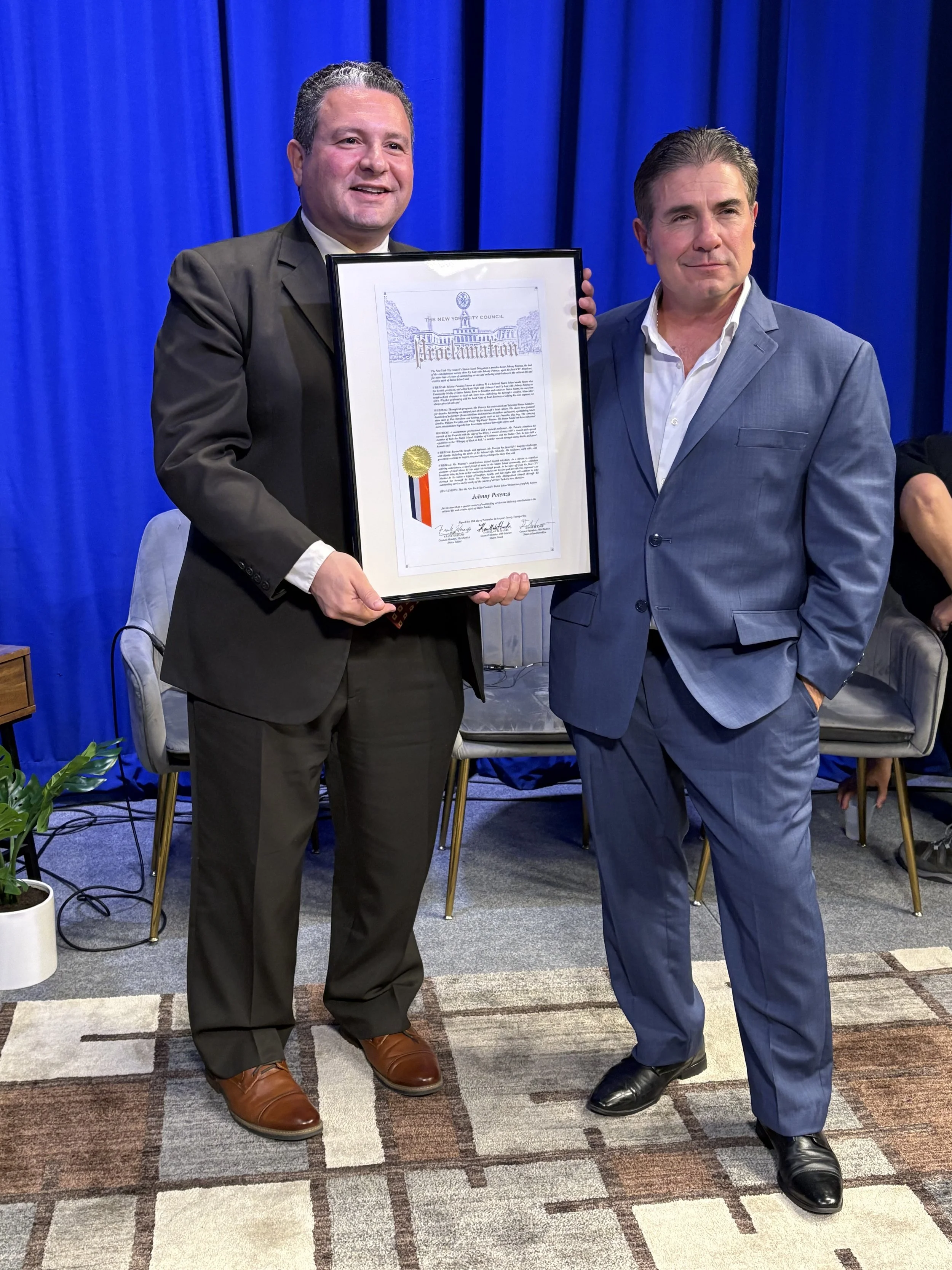 LAST & FINAL show we had a blast to a full packed studio audience at the at CMSI Public Access TV Station Nov.18, 2025. It was a complete honor & surprise to be presented at my final Up Late with Johnny Potenza Show by my good friend & colleage Frank Morano from the New York City Council the "Proclamation Award”. Thank you for this award it is much appreciated. For the first time I am lost for words, God Bless #frankmorano #newyorkcitycouncil #entertainment #gabcinqueband #sandybluesyes #comedy #follow #actor #producer #community #livemusic #communitymediaofstatenisland #statenislandcommunitytelevision